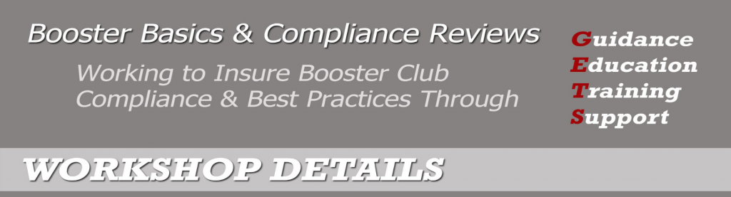 The Booster Basics Workshops provide both school administrators and booster club officers with workshops up to twice yearly and year-long support with focus on insuring that booster clubs are following district, state and federal regulations and conducting activities with best practices to help minimize risks, liabilities and challenges – for ALL PARTIES!